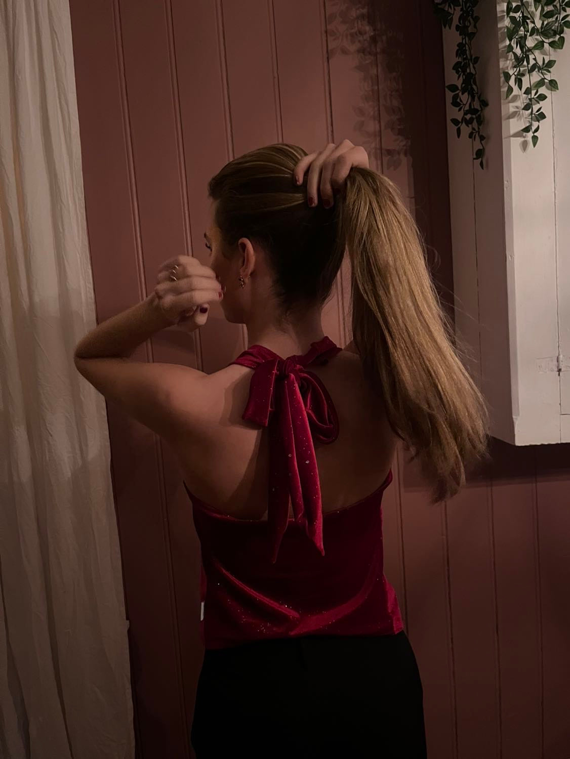 Halterneck toppene inneholder mye stretch og knytes i nakken. De lages i størrelse onesize (Xs-M)